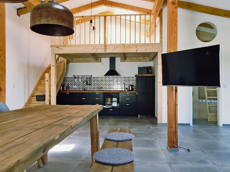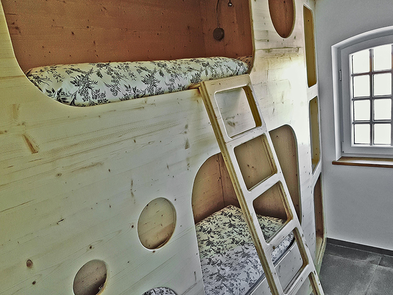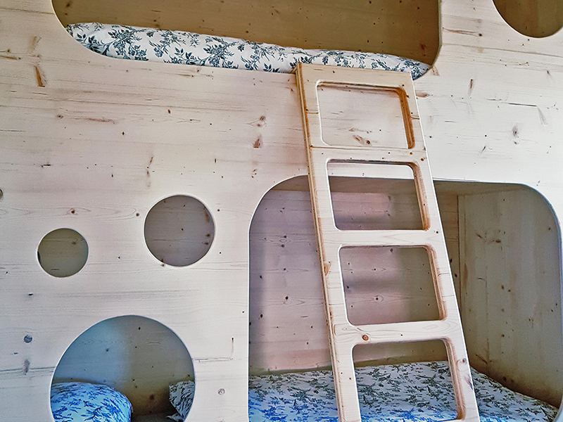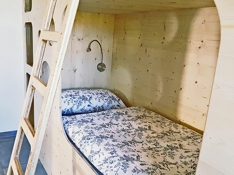 In zwei Schlafzimmern, eines mit Doppel- und eines mit Hochbett können vier Personen gemütlich schlafen. Auf dem Podest befindet sich ein fünfter Schlafplatz für kleine Abenteurer mit Blick in den Sternenhimmel - wenn auch der Einstieg für Erwachsene etwas niedrig ist.